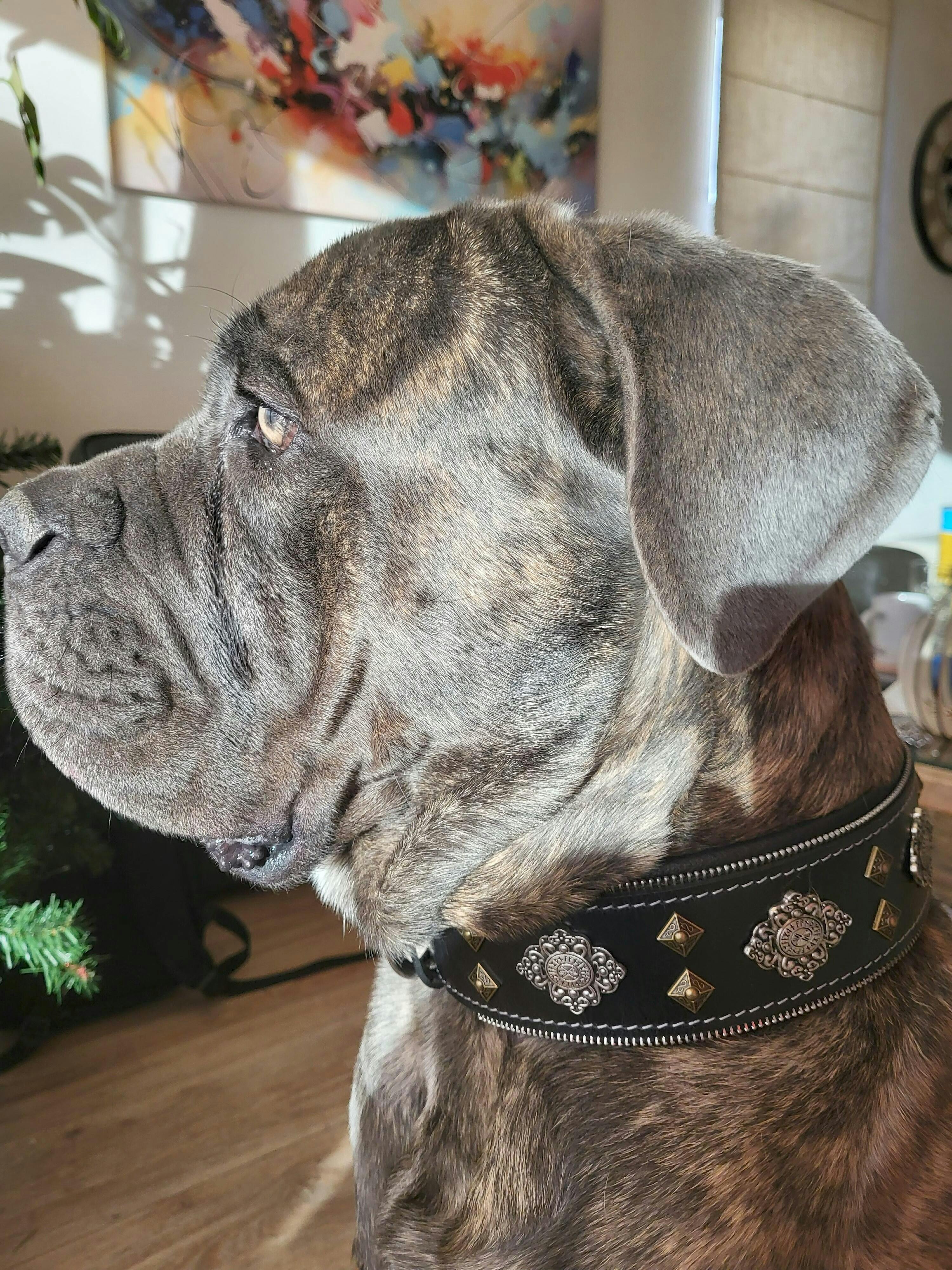 The Aztec Collar is a true statement piece, blending bold design with fine European craftsmanship. At 2.5 inches (6.3 cm) wide, it stands as one of our signature heavy-duty collars — made to impress, made to last.